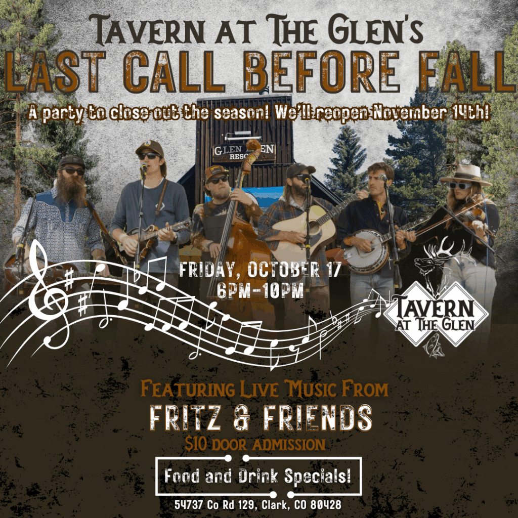 FRIDAY, OCTOBER 17⁠ ⁠ 🍂🎶 One more party before we hit pause for the season! 🎶🍂⁠ ⁠ Join us at Tavern at The Glen for the 'Last Call Before Fall' featuring Fritz & Friends! 🤠🎸⁠ ⁠ We’re shutting down for our fall break (Oct. 20–Nov. 13), but not before throwing one more boot-stomping, glass-clinking, good-time concert. Grab your crew, raise a pint, and send us into fall with one of your favorite local bands!⁠ ⁠ $10 cover⁠ Food + drink specials all night⁠ Memories you don’t want to miss